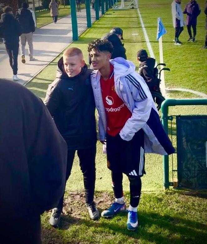 球迷和JJ加布里埃尔在U18曼市德比赛后合影,本场比赛加布里埃尔打入1个进球,球队3-1击败曼城。