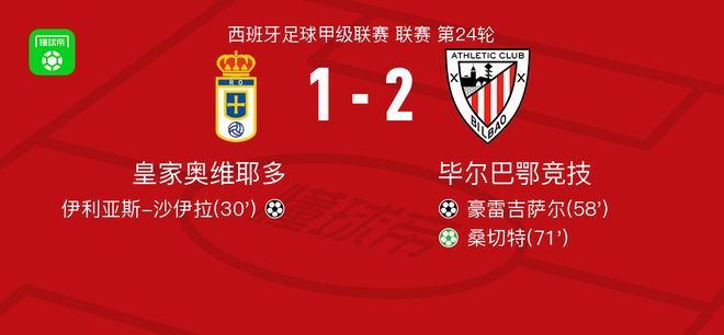 北京时间2月15日西班牙足球甲级联赛 联赛 第24轮,皇家奥维耶多主场对阵毕尔巴鄂竞技。皇家奥维耶多伊利亚斯-沙伊拉破门。毕尔巴鄂竞技豪雷吉萨尔破门,桑切特破门。最终比分皇家奥维耶多 1-2 毕尔巴鄂竞技。