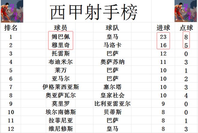 射手榜方面,姆巴佩23球继续领跑,穆里奇今天打入一球,将和姆巴佩的差距缩小到7球。第3的托雷斯落后姆巴佩就有点多了,差了11球之多。埃尔南德斯,拉菲尼亚和维尼修斯8球刚好挤入前十。