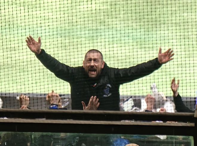 北看台的死忠球迷区旗帜一直在飘扬。整个北看台,从下到上全都是死忠球迷。整场比赛,他们都在歌唱,欢呼,主队进球时会疯狂庆祝,裁判的判罚稍微令他们不满意,刺耳的嘘声则会响彻全场。