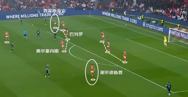 这一次的进攻,最初来自于琼阿梅尼的远射,在被封堵之后,皮球转移到侧翼,随后传中球打禁区后点。