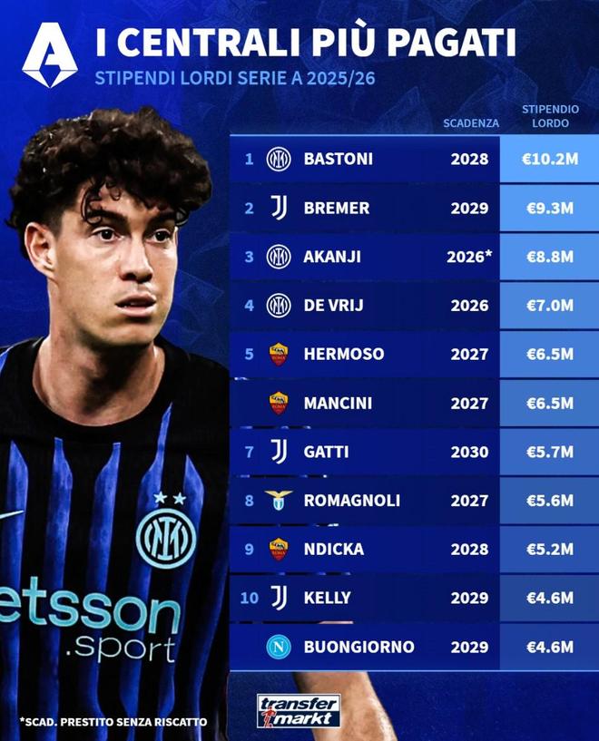 北京时间2月17日,德转统计出了2025-26赛季意甲税前工资最高10名中后卫,巴斯托尼以1020万欧元高居第一,布雷默930万欧元第二,阿坎吉880万欧元第三。