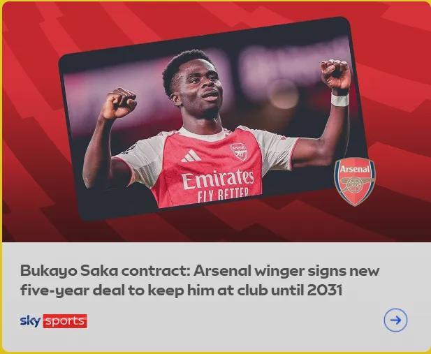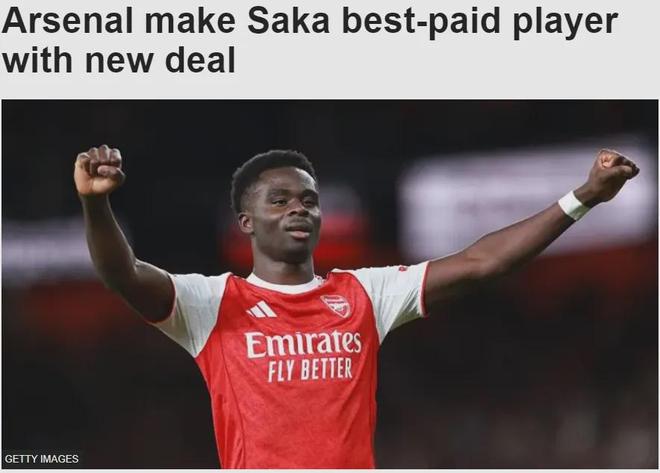 BBC记者SM消息,萨卡和阿森纳签下了一份2031年到期的5年合同,而续约后萨卡将成为阿森纳队内顶薪球员(没写之一),周薪在30万英镑以上(in excess of £300,000 a week)。