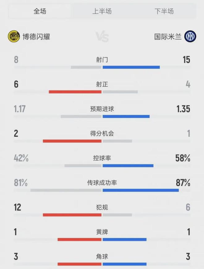 反观国米,全场比赛的表现堪称“离谱”。从数据上看,他们看似占据绝对优势:58%的控球率、15次射门,远超博德闪耀的42%控球和8次射门,但效率却低得令人发指——仅4次射正,只靠埃斯波西托的进球勉强挽回颜面。而博德闪耀则将“效率为王”发挥到极致,8次射门6次射正,3次洞穿国米球门,每一次反击都精准致命,让意甲豪门的后防线形同虚设。