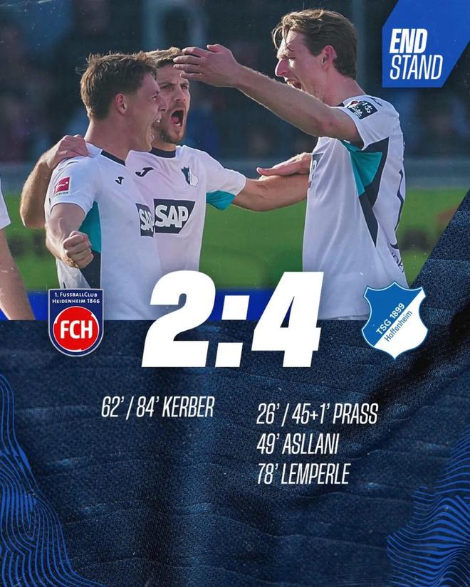 北京时间3月7日晚10点30分,“副班长”海登海姆主场挑战联赛第三霍芬海姆。上半场比赛,阿斯拉尼脚后跟妙传,普拉斯跟进推射帮助霍芬海姆取得领先,随后克拉马里奇助攻普拉斯完成梅开二度。下半场比赛,阿斯拉尼补射建功,贝伦斯大力手抛球助攻克贝尔扳回一城,主队球员康特进球被吹,杜尔长驱直入传中,伦佩尔吃饼得手扩大比分,贝伦斯角球再度助攻克贝尔破门。最终,霍芬海姆4比2击败海登海姆,送对手12轮联赛不胜。