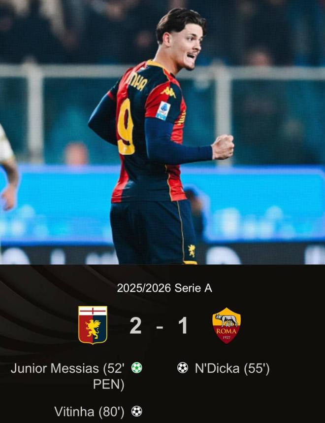 逃过一劫的热那亚在比赛尾声完成致命一击。第81分钟,维蒂尼亚门前包抄铲射破门,罗马1-2再度落后。随后主帅加斯佩里尼在场边疯狂指挥弟子压上,试图扳平比分,可所剩时间无几。最终比分定格在2-1,热那亚爆出大冷门。