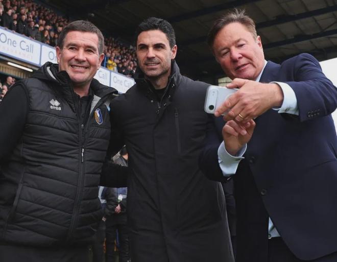 曼斯菲尔德主帅Nigel Clough和他们俱乐部的老板比赛前和阿尔特塔合影。