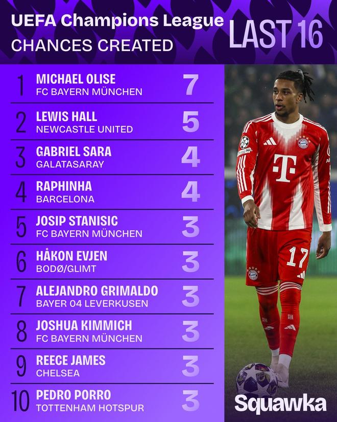 此外,据统计,本场比赛奥利塞创造出7次机会,这是欧冠1/8决赛首回合最高数据,也是他个人在单场欧冠中的新纪录。