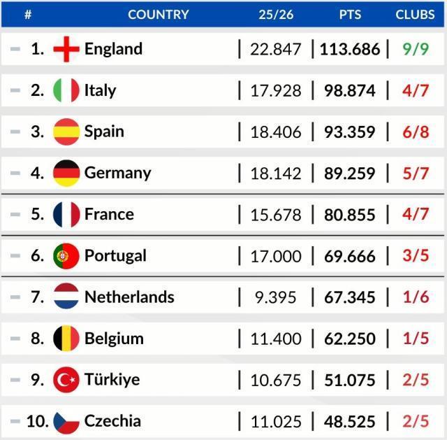 英超在欧足联系数积分榜上遥遥领先