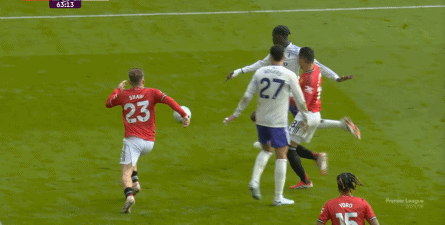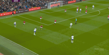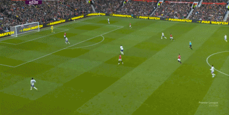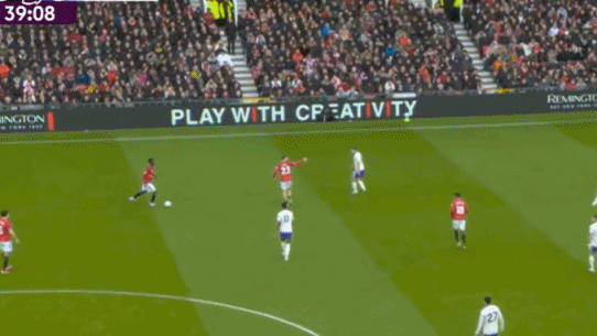 麦金的斜插,从盯人角度来说,应该是卢克-肖负责,但到了这个位置,卢克-肖首先要镇守自己的区域,毕竟不能被打击到宽度,而从区域的角度来说,应该是梅努负责,但他并没有去提前预判和启动身体: