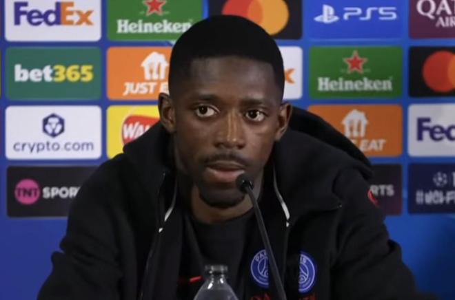 北京时间3月18日,欧冠1/8决赛次回合,切尔西将对阵巴黎圣日耳曼。赛前,巴黎圣日耳曼球员登贝莱出席了发布会。