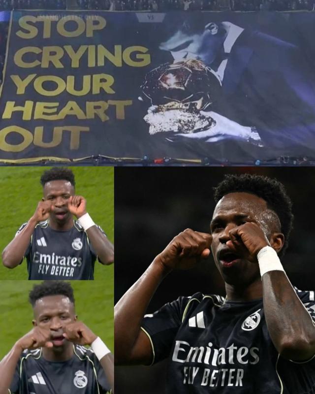 第22分钟,维尼修斯操刀点球骗过唐纳鲁马得分,皇马1比0领先,总比分4比0。进球后,维尼修斯做出“爱哭鬼”的动作,回击曼城球迷准备的罗德里巨型海报,并跑到角旗处示威庆祝。