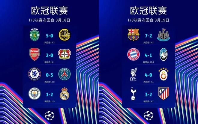 北京时间3月19日,欧冠1/8决赛次回合最后四次对决结束。本轮,英超球队遭遇重创,切尔西、曼城分别遭巴黎、皇马双杀出局,热刺虽主场险胜马竞仍填客场惨败大坑,首回合主场战平巴萨的纽卡斯尔联则在客场2比7惨遭屠戮——除阿森纳轻取勒沃库森获得晋级门票外,仅利物浦主场四球大胜加拉塔萨雷逆转总比分晋级;西甲三强则全部晋级8强,展现底蕴;葡萄牙体育常规时间3比0、总比分3比3战平博德闪耀进入加时赛,加时赛葡体再进2球,完成神奇逆转送黑马出局;拜仁则再送意甲独苗亚特兰大一场惨败,总比分10比2轻松过关。