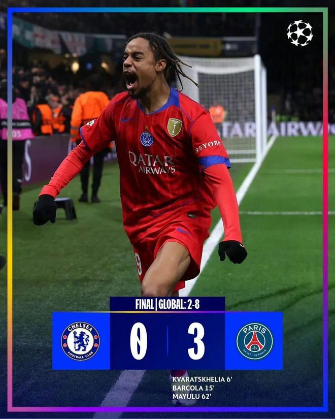 北京时间3月18日,欧冠八分之一决赛次回合较量,同样3球落败的切尔西回到斯坦福桥球场迎战巴黎圣日耳曼。上半场比赛,萨尔开场停球出现失误,克瓦拉茨赫利亚扛开防守队员低射首开记录,巴尔科拉建功,切尔西短短8分钟内连失2球,克瓦拉茨赫利亚破门被吹,桑切斯化解单刀。下半场比赛,马尤卢破门扩大比分,切尔西反扑收获甚微。最终,巴黎圣日耳曼客场3比0、总比分8比2大胜切尔西晋级8强。
