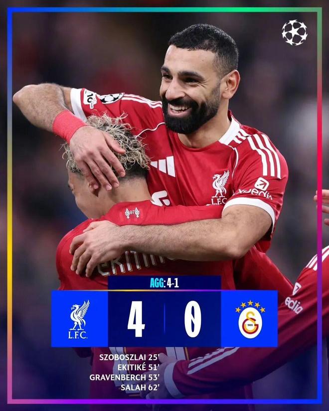 北京时间3月19日凌晨4点,欧冠八分之一决赛次回合较量,首回合0比1输球的利物浦回到主场再战加拉塔萨雷。上半场比赛,麦卡利斯特角球助攻索博斯洛伊推射破门,随后索博斯洛伊造点,萨拉赫点球被恰基尔扑出。易边再战,萨拉赫助攻埃基蒂克建功取得两球领先,赫拉芬贝赫补射扩大比分,辛戈乌龙由于弗林蓬越位在先被吹,萨拉赫内切世界波破门完成一传一射。最终,利物浦4比0、总比分4比1复仇加拉塔萨雷,淘汰赛下轮将战巴黎圣日耳曼。