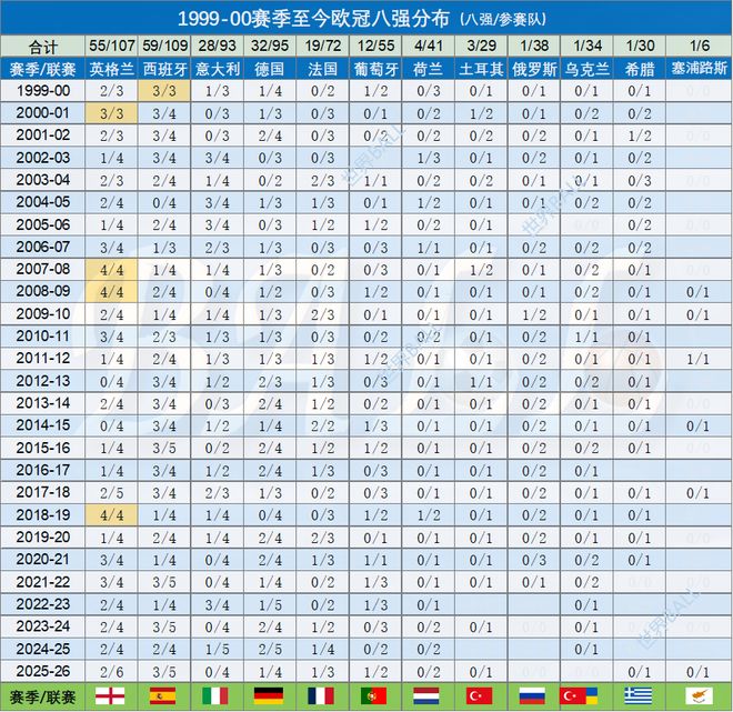 2、金黄色标注的数据,表示一国出征欧冠小组赛(联赛)球队数量不低于3支,且全部晋级八强的情况。