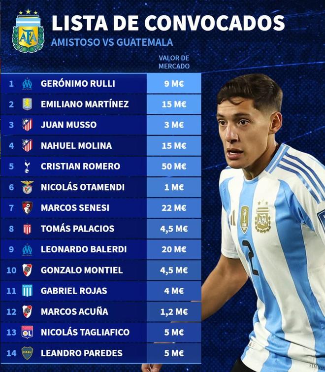 阿根廷国家队新一期大名单德转身价榜: