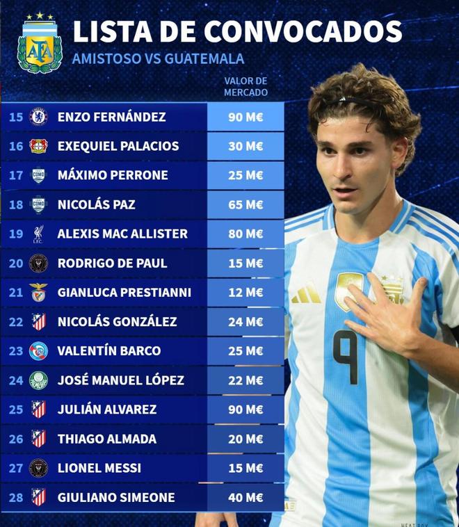 北京时间3月19日,在阿根廷国家队公布新一期大名单之后,德转也列出了阿根廷队此次28人大名单的身价排行榜,胡利安-阿尔瓦雷斯和恩佐-费尔南德斯同以9000万欧元并列第一,麦卡利斯特8000万欧元第三,梅西1500万欧元。
