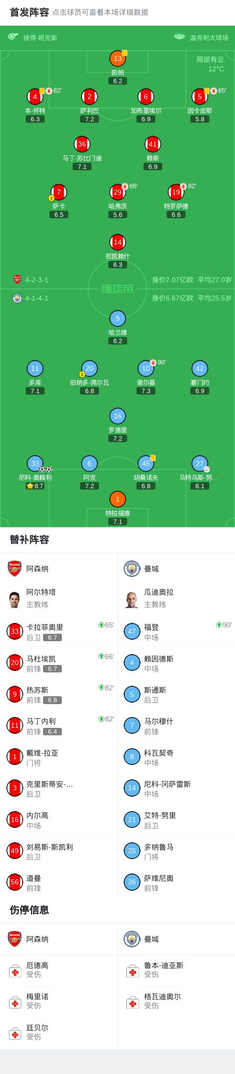 第82分钟,热苏斯、马丁内利登场,特罗萨德、本-怀特下