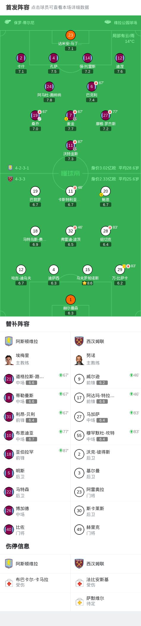 第68分钟,罗杰斯射门被扑,沃特金斯补射破门,维拉2-0西汉姆联
