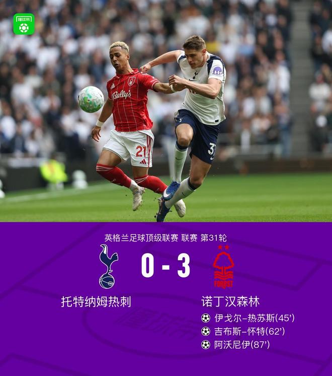 北京时间3月22日英格兰足球顶级联赛 第31轮,托特纳姆热刺主场对阵诺丁汉森林。上半场,威廉斯角球开出,热苏斯头球破门。下半场,怀特、阿沃尼伊相继破门,锁定胜局。最终比分热刺 0-3 诺丁汉森林。