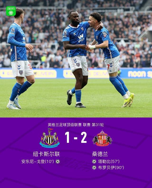 北京时间3月22日,英格兰足球顶级联赛第31轮,纽卡斯尔联主场对阵桑德兰。比赛中,安东尼-戈登抓住奥尼安失误首开记录,塔勒比角球乱战扳平比分,布罗贝伊献绝杀。最终,桑德兰2-1联赛双杀纽卡。