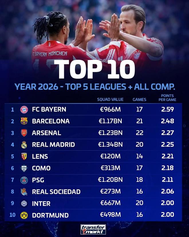 北京时间3月24日,德转统计出了2026年至今欧洲五大联赛球队各项赛事场均积分前10名,拜仁慕尼黑以2.59分高居第一,巴塞罗那以2.48分排名第二,阿森纳2.27分排名第三。