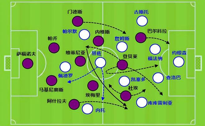 作为鲁伊斯的上位替代。恩佐不只是能做临时的小支点,也合适搭档登贝莱。毕竟登贝莱活动范围大,但力量不足。巴黎的战术需要登贝莱大范围回撤和返跑,完成转移球驱动两翼推进。在带领边路起速方面,恩佐也是行家,特点很合拍。