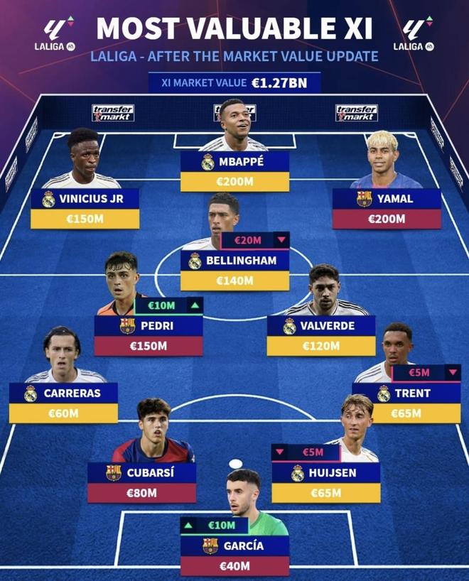 最近德转更新了西甲球员身价,并排出了一套西甲最贵阵容。姆巴佩和亚马尔同为2亿欧元,维尼修斯和佩德里都是1.5亿欧元,贝林厄姆1.4亿欧元,巴尔韦德1.2亿欧元,光是中前场这几个人,身价就已经高得吓人。单看总身价,这套阵容确实很夸张,但身价高不等于位置搭配就一定最顺,也不等于实战表现就一定最强。把这些高身价球员放到同一套首发里,前场、中场、后防的真实战斗力,真的和身价排序一样靠谱吗?