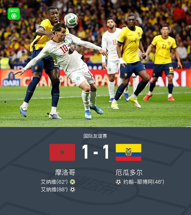 北京时间3月28日国际友谊赛,摩洛哥对阵厄瓜多尔。下半场耶博阿首开记录,艾纳维造点亲自主罚被扑,哈里马特补射进球因越位被吹,88分钟艾纳维头球破门扳平比分。最终比分摩洛哥 1-1 厄瓜多尔。